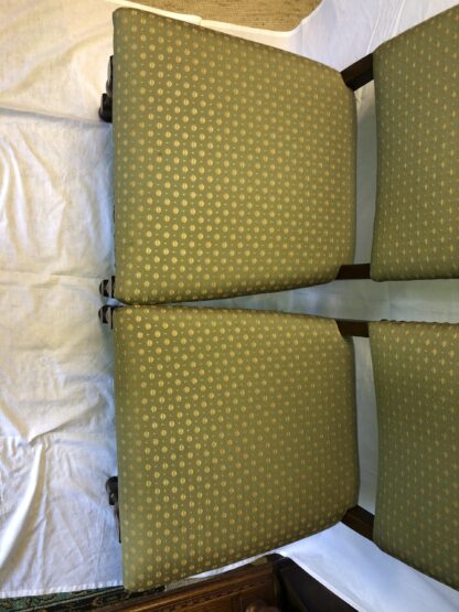 Két darab gótikus, faragássokkal díszített, újrakárpitozott, kifogástalan székek. Kárpitja zöldes tónusú. A képek nem adják vissza a kárpit igazi szép színét. Masszív, kifogástalan darab. Az ár 2 db székre vonatkozik.