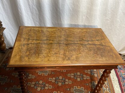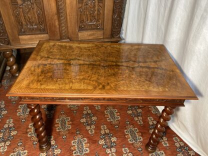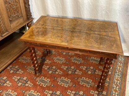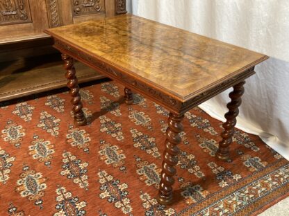 Barley csavart lábú asztal. Az asztal lapja is hibátlan mestermunka, dió furnéros a frizen körbefutó faragásokkal díszített. A bútor anyaga dió és mahagóni. Származása: Anglia. A csavart lábú bútorok Angliában a Stuart-korszakba, Franciaországban XIII. Lajos és XIV. Lajos korszakába nyúlnak vissza. Ez idő alatt sok bútorgyártó gyártott asztalokat és székeket csavart lábakkal. A barley, azaz árpacsavar elnevezés az akkoriban szeretett árpa- cukorkából származik.