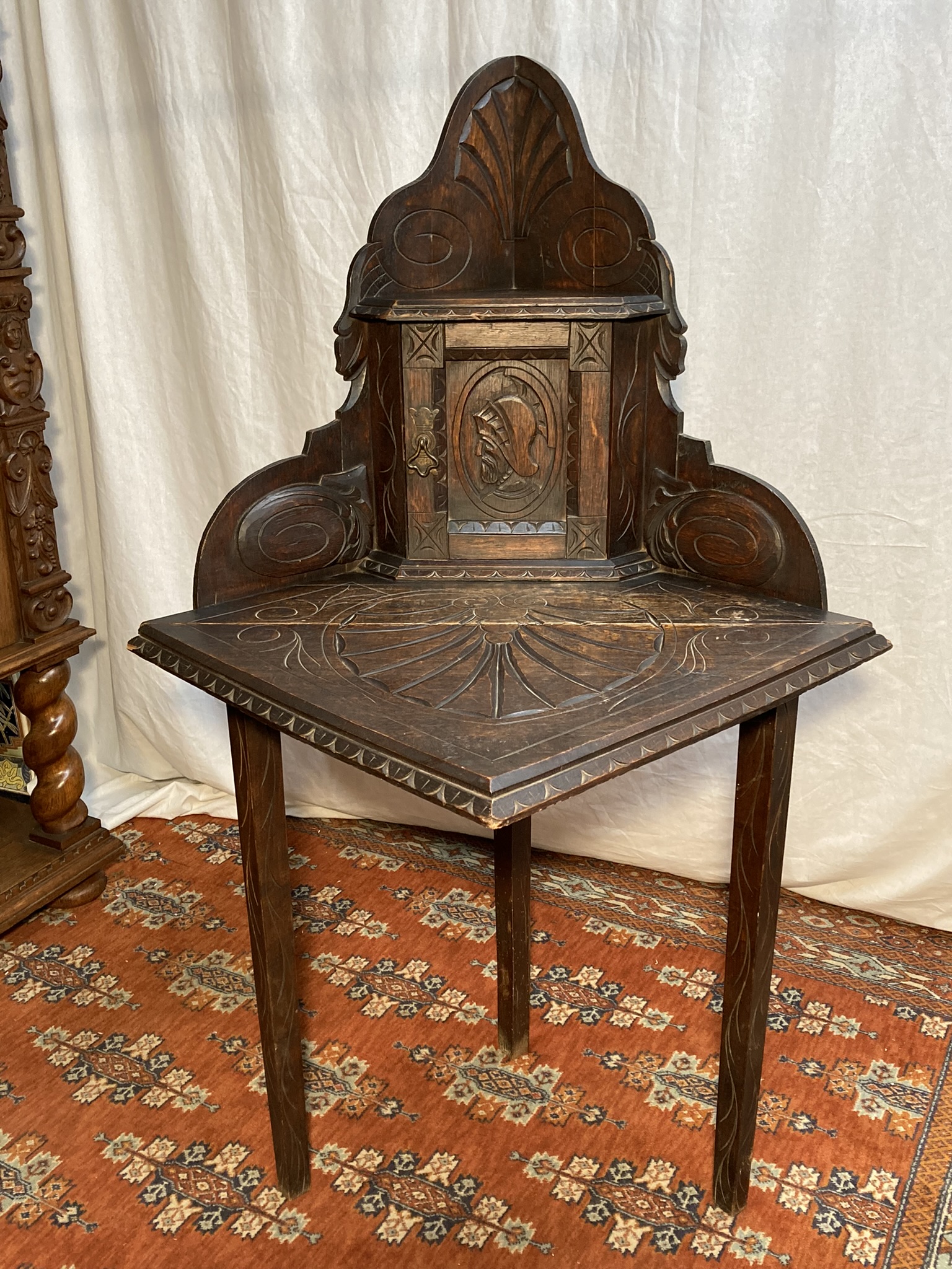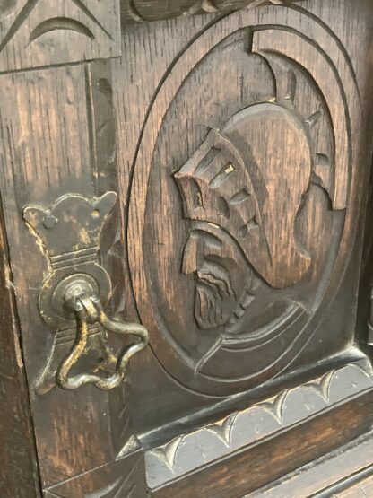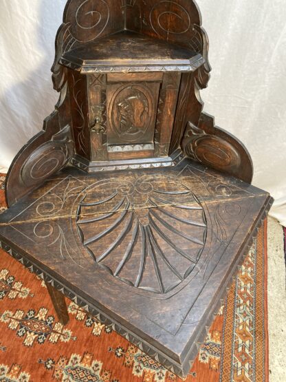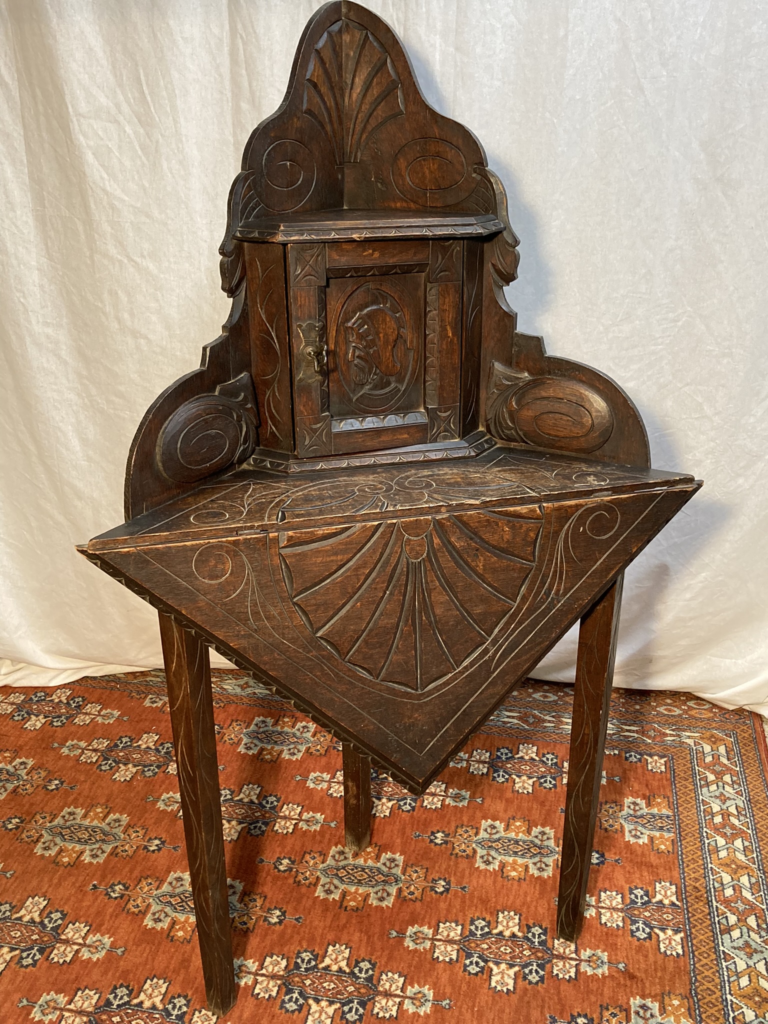 Gótikus dohánytartó sarokszekrény lenyitható lapsarokkal, ajtaján faragott lovagfej ábrázolással, lábain végigfutó inda faragással. Szerkezetileg stabil, kifogástalan állapotú. Igazán ritka darab!
