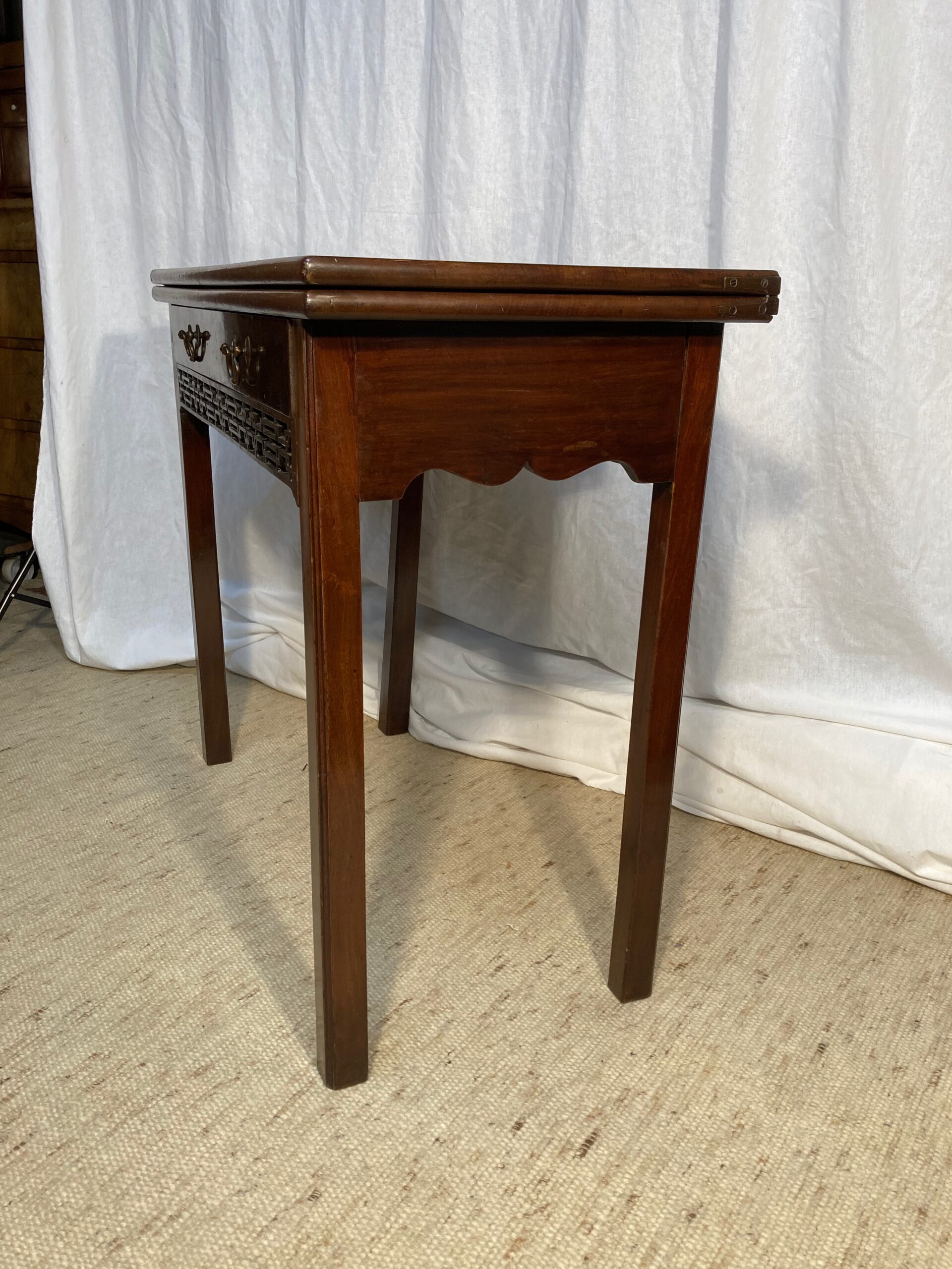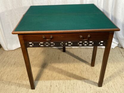 Antik mahagóni kártya asztal, melynek egy hátsó lábát kihúzva, lapját szétnyitva, posztós játékfelület válik szabaddá. A fiók alját áttört szegély dísz keretezi, a két felső lapot fém pántok kötik össze.